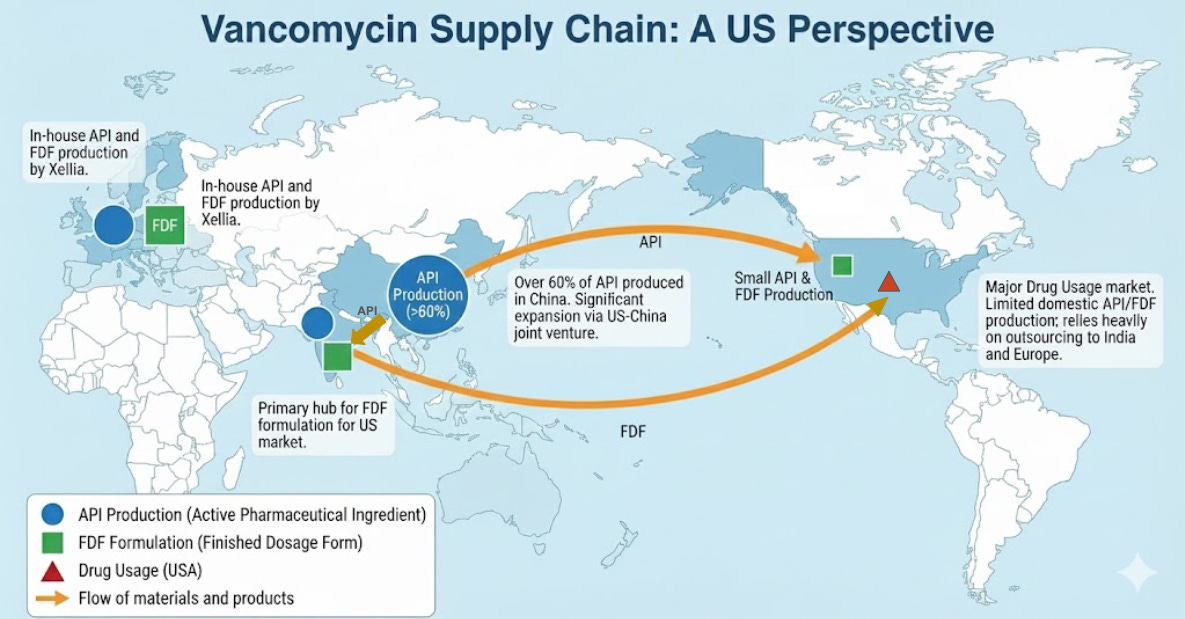 The vancomycin API (product produced during manufacture) is primarily done in China and India with over 60% of API production occurring in China. The formulation stage consisting of taking the API and making it ready for use often occurs in India for the US market. In Europe, the company Xellia produces both the API and the FDF via in-house formulation. The US does comparatively very little API production or formulation for vancomycin, primarily outsourcing to India or Europe. Notably, the US company Alpharma is involved in a joint venture with the Chinese company Hisun to expand vancomycin API production further in China – estimated to double supply by 2026.